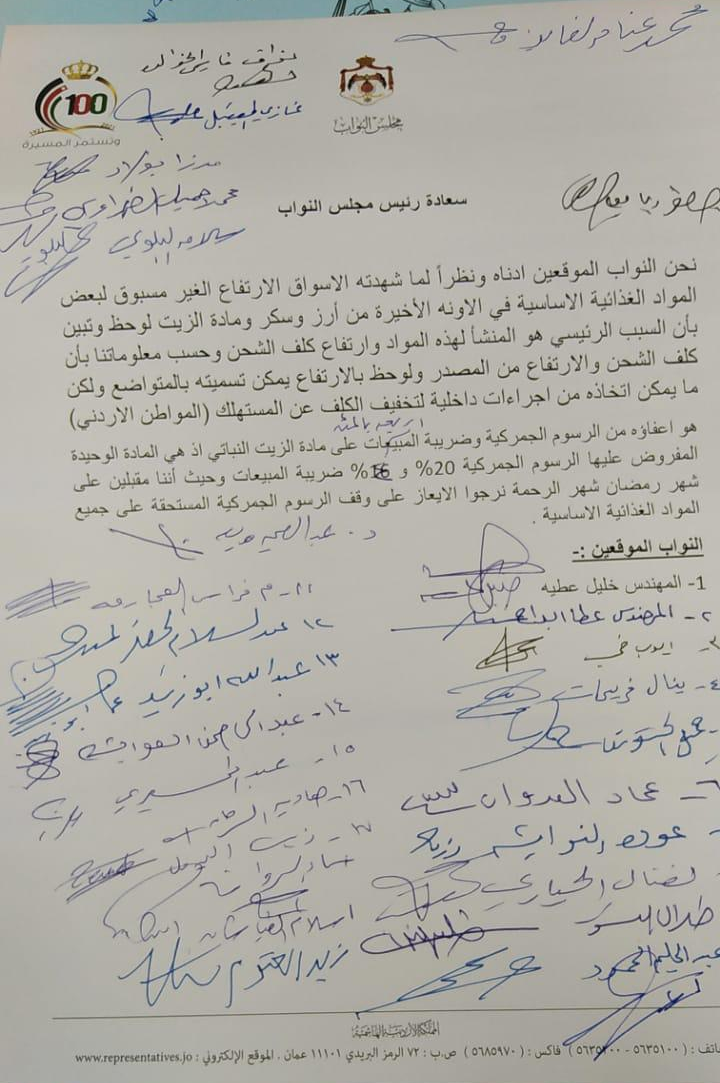 نحن النواب الموقعين ادناه ونظراً لما شهدته الاسواق الارتفاع الغير مسبوق لبعض المواد الغذائية الاساسية في الاونه الأخيرة من أرز وسكر ومادة الزيت لوحظ وتبين بأن السبب الرئيسي هو المنشأ لهذه المواد وارتفاع كلف الشحن وحسب معلوماتنا بأن كلف الشحن والارتفاع من المصدر ولوحظ بالارتفاع يمكن تسميته بالمتواضع ولكن ما يمكن اتخاذه من اجراءات داخلية لتخفيف الكلف عن المستهلك (المواطن الاردني)