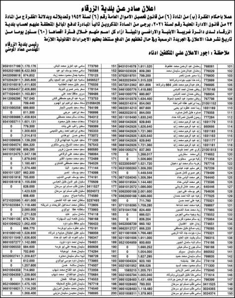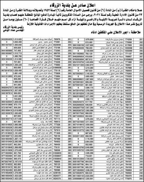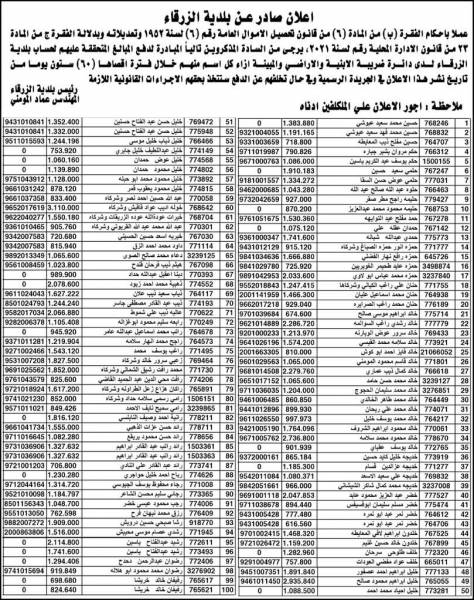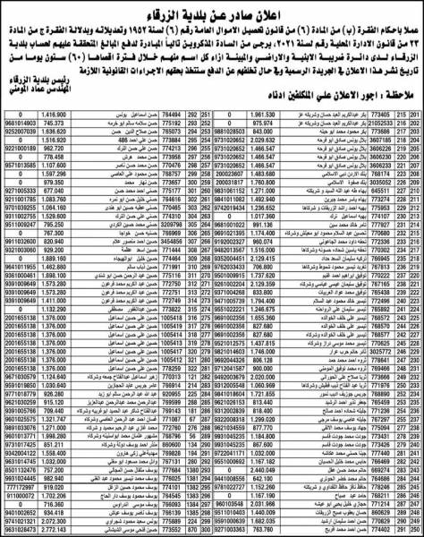بلدية الزرقاء تنشر دفعة من اسماء الأشخاص المتخلفين عن دفع الضرائب عليهم