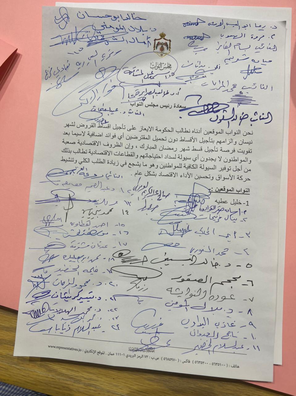 نحن النواب الموقعين أدناه نطالب الحكومة الايعاز على تأجيل اقساط القروض لشهر نيسان والزامهم بتأجيل الأقساط دون تحميل المقترضين أي فوائد اضافية لاسيما بعد تفويت فرصة تأجيل قسط شهر رمضان المبارك ، وإن الظروف الاقتصادية صعبة والمواطنون لا يجدون أي سيولة لسداد احتياجاتهم والقطاعات الاقتصادية تطالب بذلك من أجل توفير السيولة الكافية للمواطنين وهو ما يشجع في زيادة الطلب الكلي وتنشيط حركة الأسواق وتحسين الأداء الاقتصاد بشكل عام .