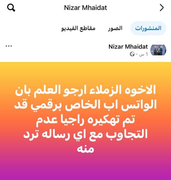 نشر مدير عام المؤسسة العامة للغذاء والدواء د. نزار مهيدات على صفحته الخاصة في شبكة التواصل الاجتماعي "فيسبوك” عن نجاح محاولة تهكير حسابه على برنامج (الواتس آب) ودعى اصدقائه لعدم الرد على أي رسالة او طلب من خلال هذا البرنامج كما وأكد على الامتناع عن اجابة لأي طلب من الممكن ان يتم .