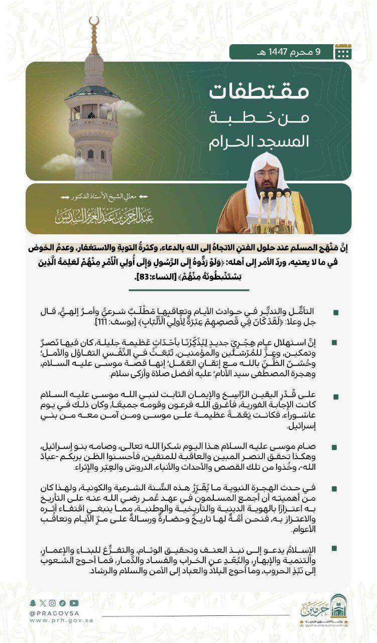 وقال معالي الشيخ الدكتور عبدالرحمن السديس في خطبة الجمعة بالمسجد الحرام: إنَّ استهلال عام هِجْرِيٍّ جديدٍ لِيُذَكِّرُنَا بأحَدَاثٍ عَظيمة جليلة، كان فيها نَصْرٌ وتمكين، وعِزٌّ للمُرْسَلين والمؤمنين، تَبْعَثُ في النَّفْسِ التفاؤل والأمل، وحُسْنَ الظَّنِّ بالله مع إتقانِ العَمَل.