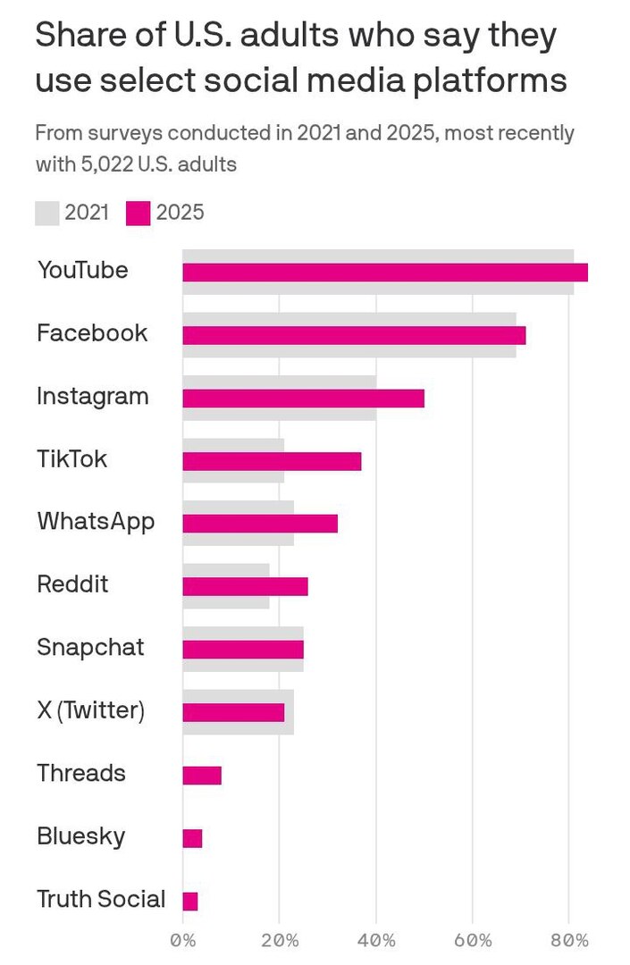 وأوضح موقع "أكسيوس" أنه بناء على استطلاعات رأي حول منصات التواصل الاجتماعي أجريت في الولايات المتحدة عامي 2021 و2025، في كلا العامين، يتصدر يوتيوب القائمة بنسبة تزيد عن 80%، يليه فيسبوك بنسبة 70% تقريبا، وقد شهدت معظم المنصات زيادة في الاستخدام باستثناء "إكس" تويتر، الذي انخفض من 23% إلى 21%.