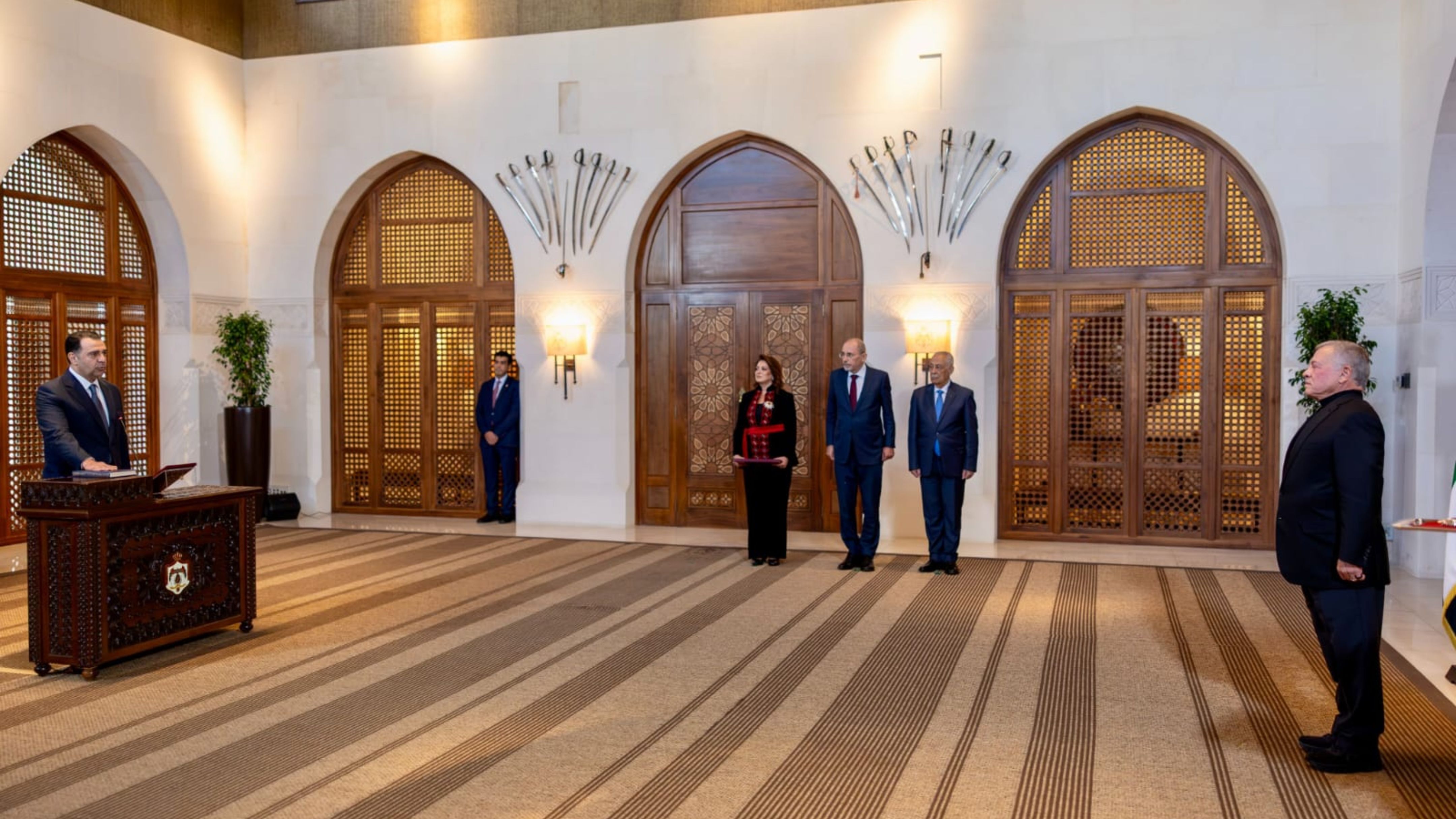 وحضر مراسم أداء اليمين، التي جرت في قصر الحسينية، رئيس الديوان الملكي الهاشمي يوسف حسن العيسوي، ونائب رئيس الوزراء ووزير الخارجية وشؤون المغتربين أيمن الصفدي.