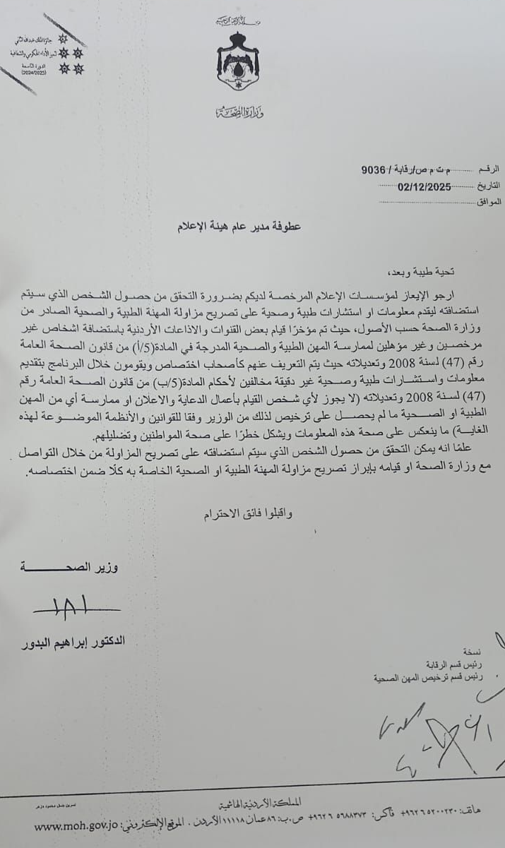 أصدر معالي وزير الصحة، الدكتور إبراهيم البدور، تعميماً رسمياً موجهاً إلى هيئة الإعلام، يهدف إلى إرساء قواعد صارمة لاستضافة الخبراء والمختصين في البرامج الطبية والصحية عبر الوسائل الإعلامية المرخصة، وهي الخطوة التي لاقت ترحيباً كبيراً وإشادة واسعة من قبل القطاع الطبي في المملكة.