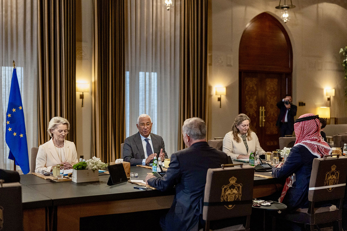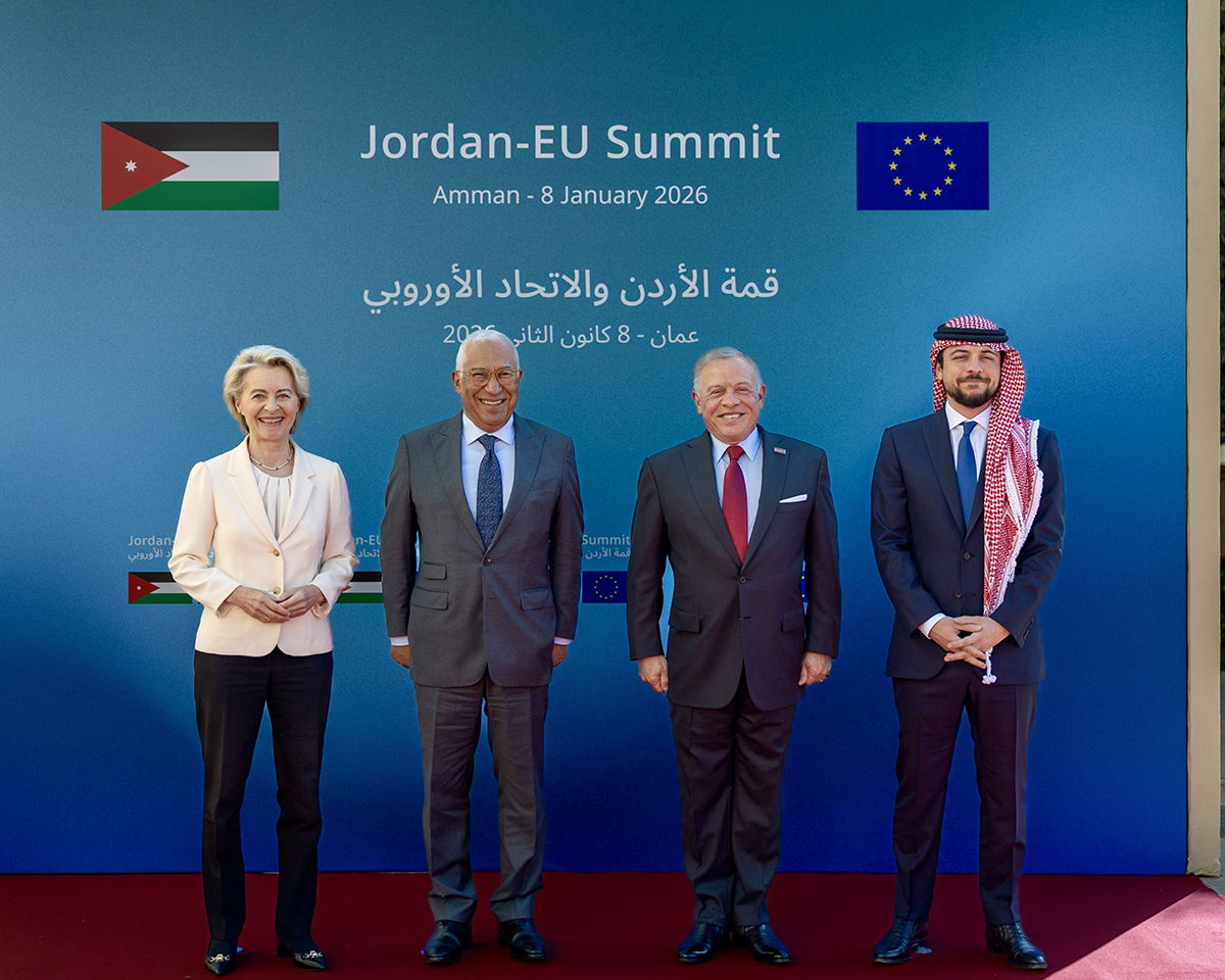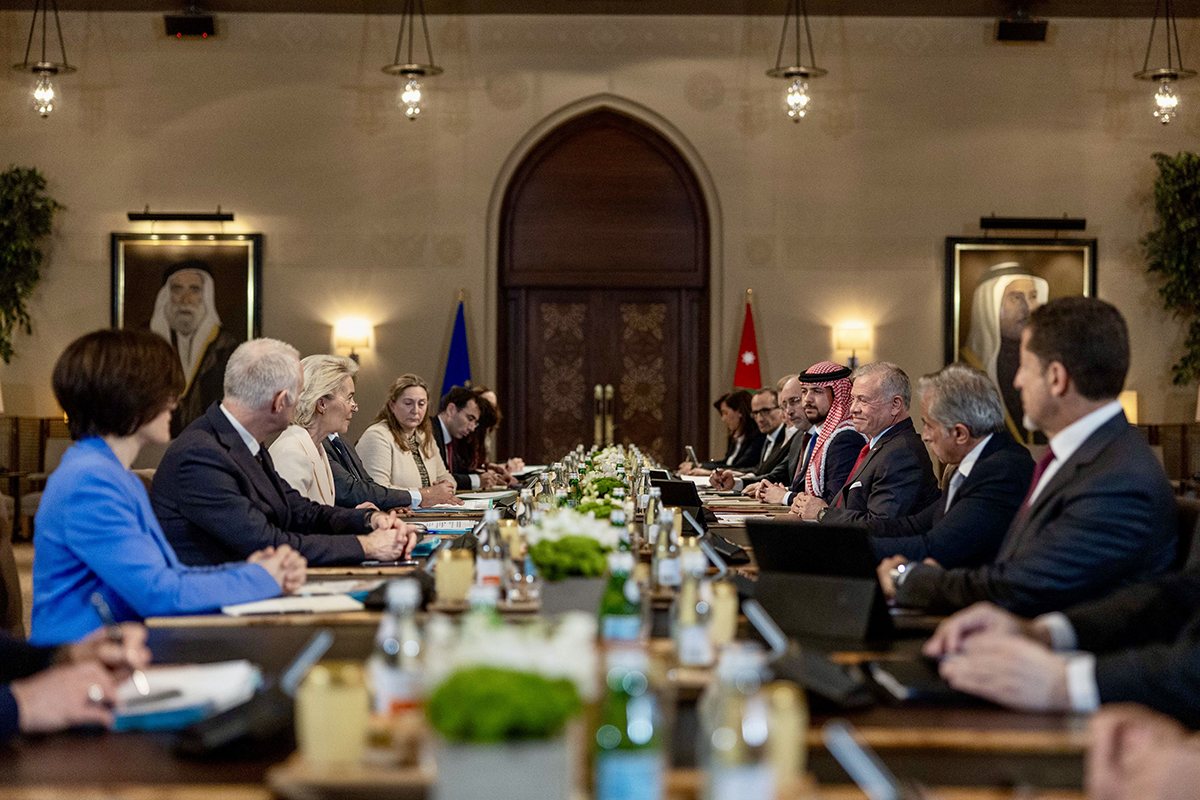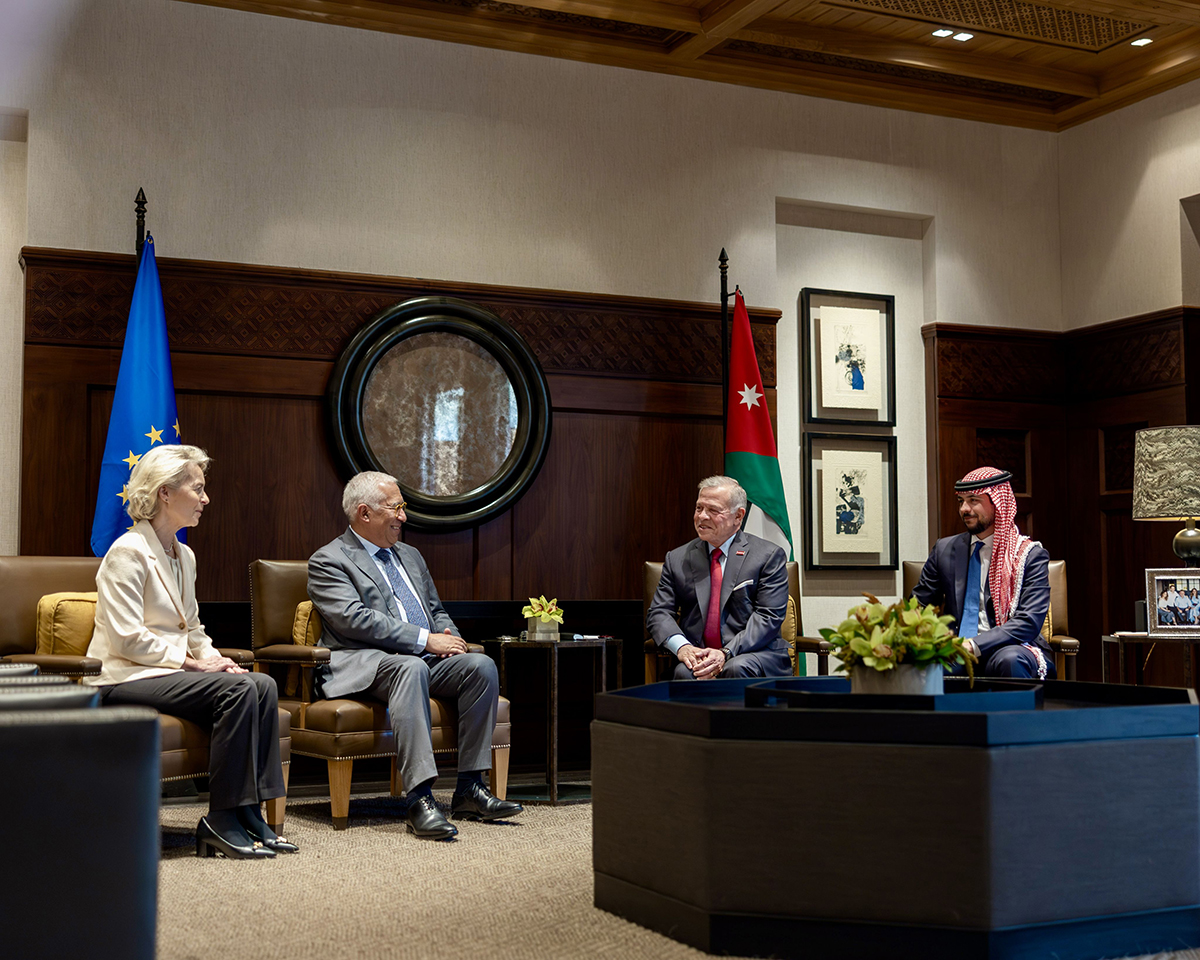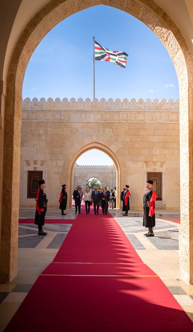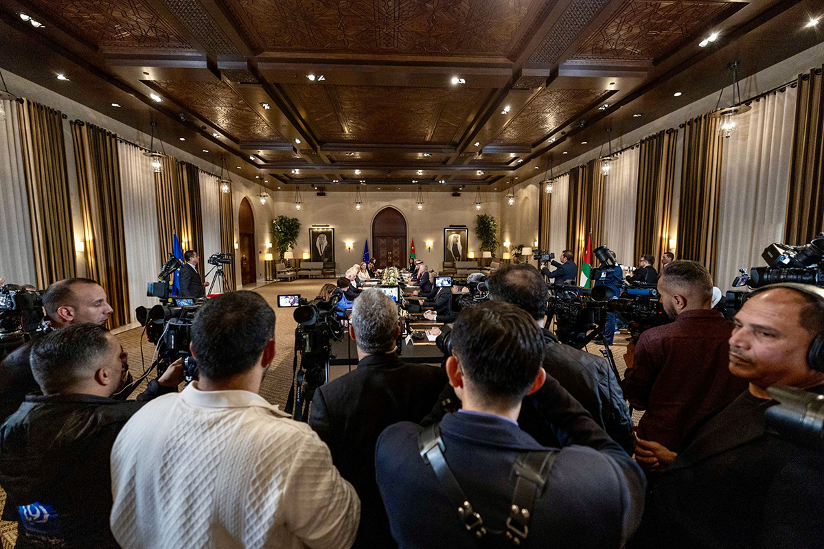 ورحب جلالة الملك في بداية مباحثات موسعة في قصر الحسينية بالمسؤولين الأوروبيين، مشيرا إلى أن هذه القمة تمثل فصلا مهما في الشراكة التاريخية بين الأردن والاتحاد الأوروبي، وتعزز العلاقات المبنية على الالتزام بالعمل من أجل الاستقرار الإقليمي والازدهار.