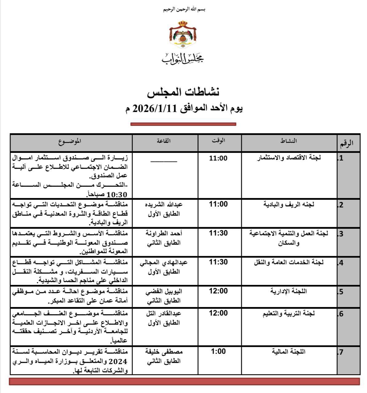 تعقد لجان نيابية مختصة في مجلس النواب، الأحد، اجتماعات لمناقشة عدد من القضايا، حيث تناقش لجنة التربية والتعليم موضوع العنف الجامعي والاطلاع على آخر الإنجازات العلمية للجامعة الأردنية وآخر تصنيف حققته عالميًا.