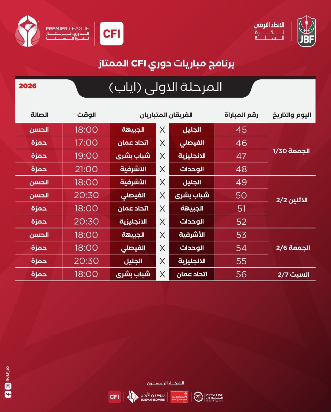 اصدر الاتحاد الارني لكرة السلة جدول مباريات إياب المرحلة الأولى لبطولة دوري CFI الممتاز للرجال للموسم 2025