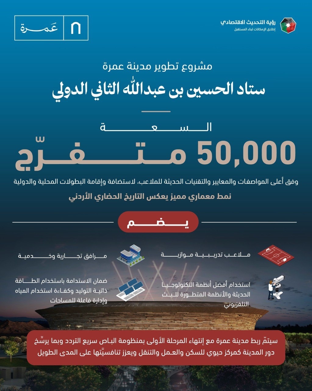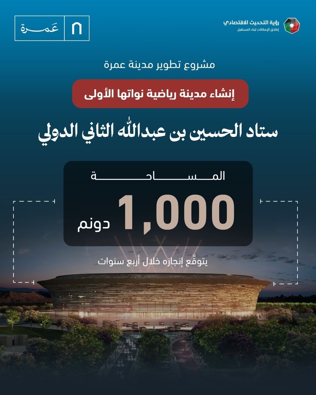 الحكومةـ أعلنت في 29 تشرين الثاني 2025 عن ملعب كرة قدم جديد باسم "ستاد الحسين بن عبدالله الثاني الدولي"، ضمن مشروع مدينة عمرة التي أطلقها رئيس الوزراء جعفر حسان.