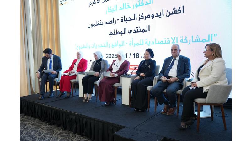 تحت رعاية وزير العمل الدكتور خالد البكار، وبالتعاون مع لجنة المرأة وشؤون الأسرة ولجنة العمل والتنمية الاجتماعية والسكان في مجلس النواب، نفّذ مركز الحياة – راصد، بالشراكة مع منظمة أكشن إيد – المنطقة العربية، اليوم المنتدى الوطني بعنوان "المشاركة الاقتصادية للمرأة: الواقع والتحديات والطموح"، وذلك بحضور مساعدتي رئيس مجلس النواب السيدة هالة الجراح والسيدة ميسون القوابعة، وبمشاركة عدد من النواب، إلى جانب نخبة من ممثلي المؤسسات الرسمية والأحزاب السياسية والنقابات ومنظمات المجتمع المدني وخبراء في قضايا العمل والمرأة.