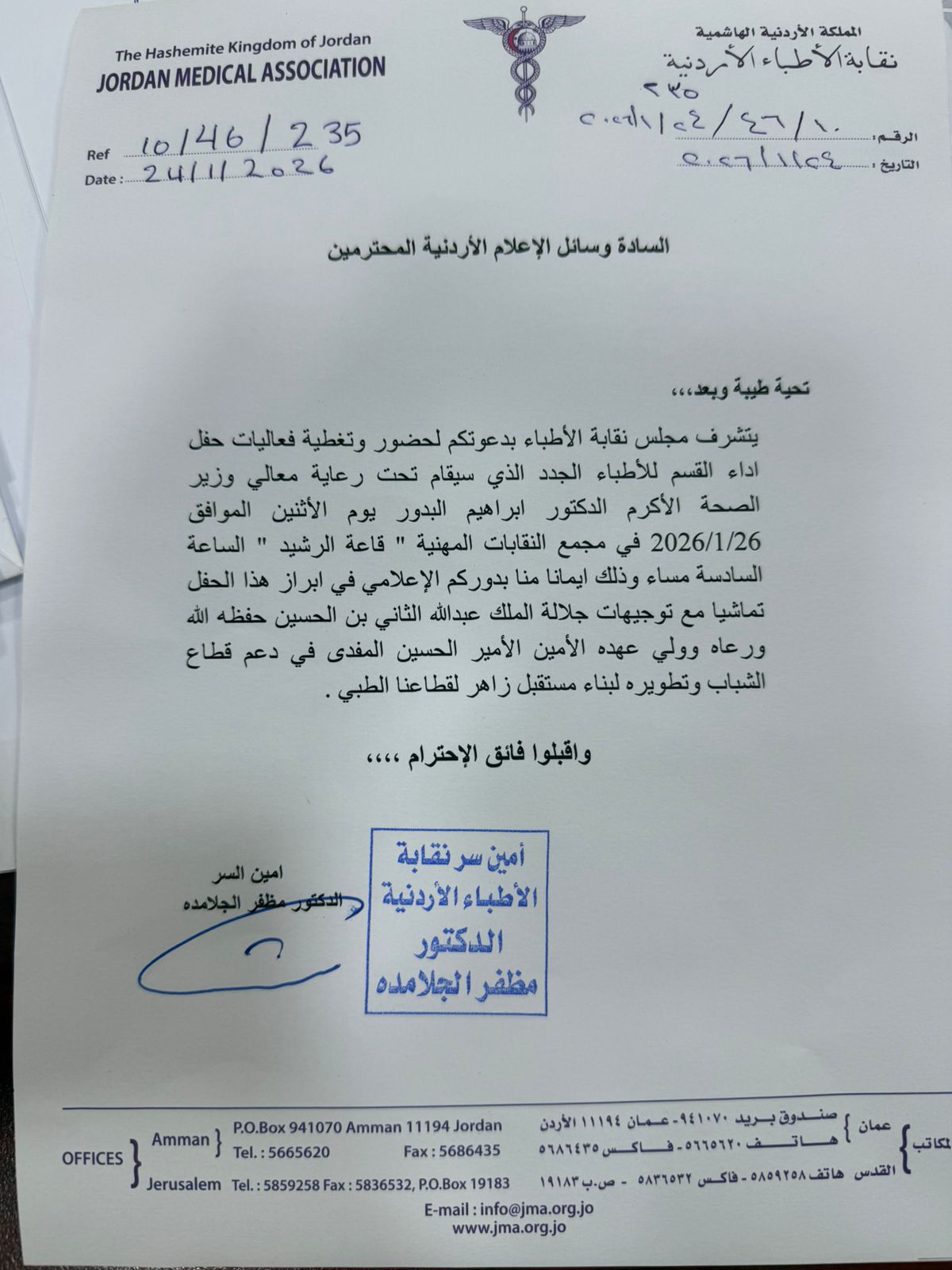 تحت رعاية معالي وزير الصحة الأكرم الدكتور إبراهيم البدور، دعت نقابة الأطباء الأردنية وسائل الإعلام الأردنية لحضور وتغطية فعاليات حفل أداء القسم للأطباء الجدد، والذي سيقام يوم الاثنين الموافق 26 كانون الثاني 2026، في قاعة الرشيد بمجمع النقابات المهنية، عند الساعة السادسة مساءً.