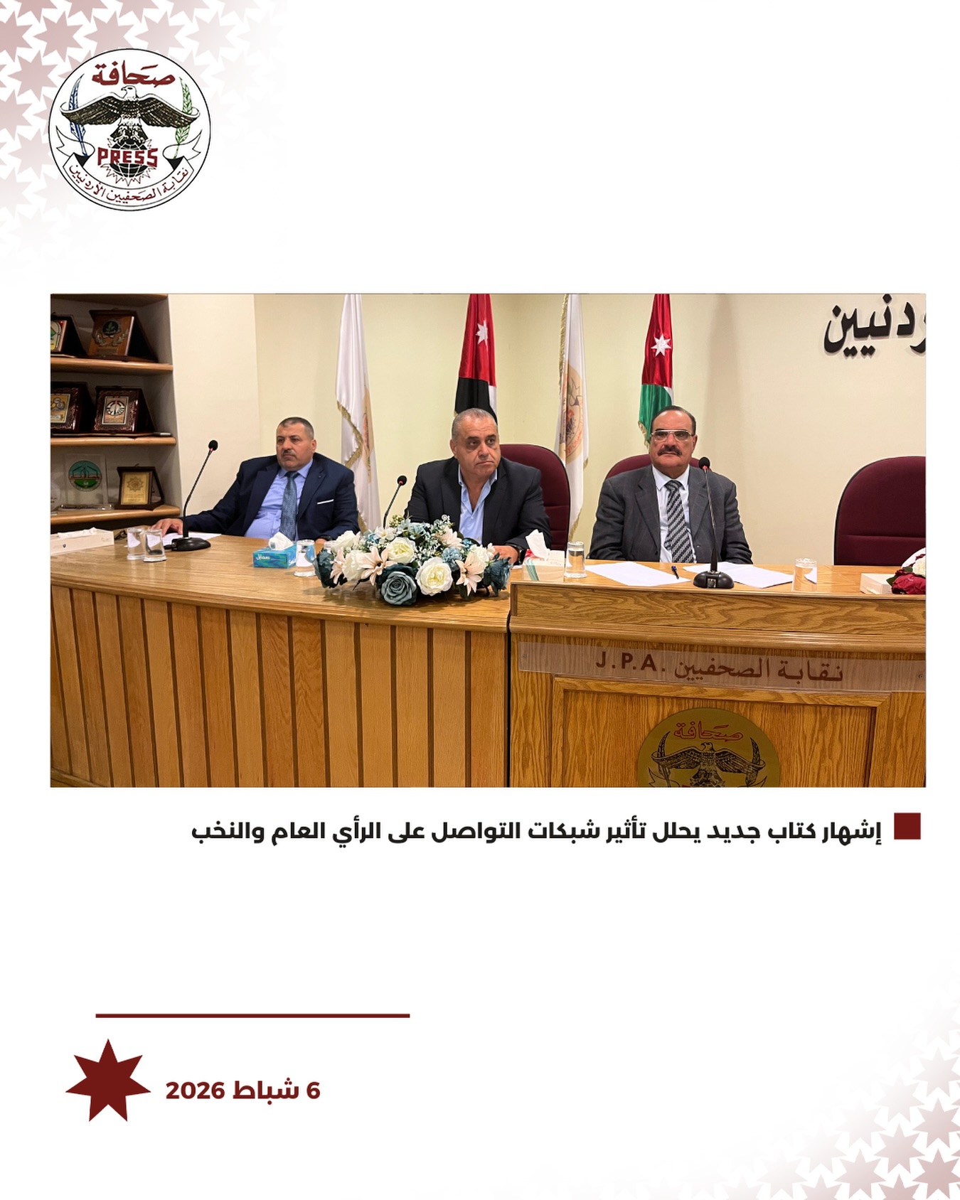 أقامت نقابة الصحفيين الأردنيين، من خلال لجنتها الثقافية، مساء السبت، حفل إشهار كتاب «وسائل التواصل الاجتماعي ودورها في توجيه الرأي العام» للزميل الدكتور علي فواز العدوان، وذلك في مقر النقابة.