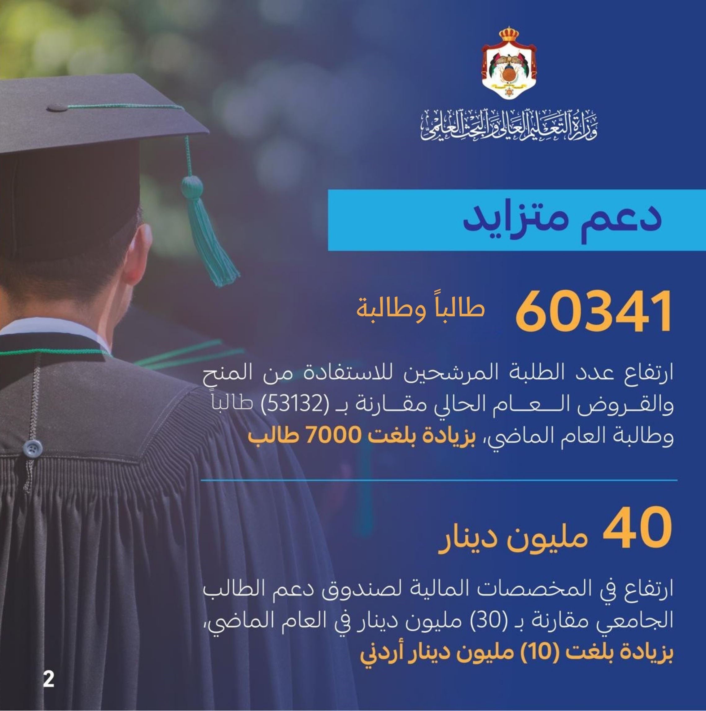 وتضمن الإعلان ارتفاع عدد الطلبة المرشحين للاستفادة من المنح والقروض من 53132 طالبا وطالبة في العام الماضي إلى 60341 طالبا وطالبة في العام الحالي، وبزيادة بلغت 7 آلاف طالب، كما ارتفعت المخصصات المالية لصندوق دعم الطالب الجامعي من 30 مليونا إلى 40 مليون دينار، وبزيادة مقدارها 10) ملايين دينار.